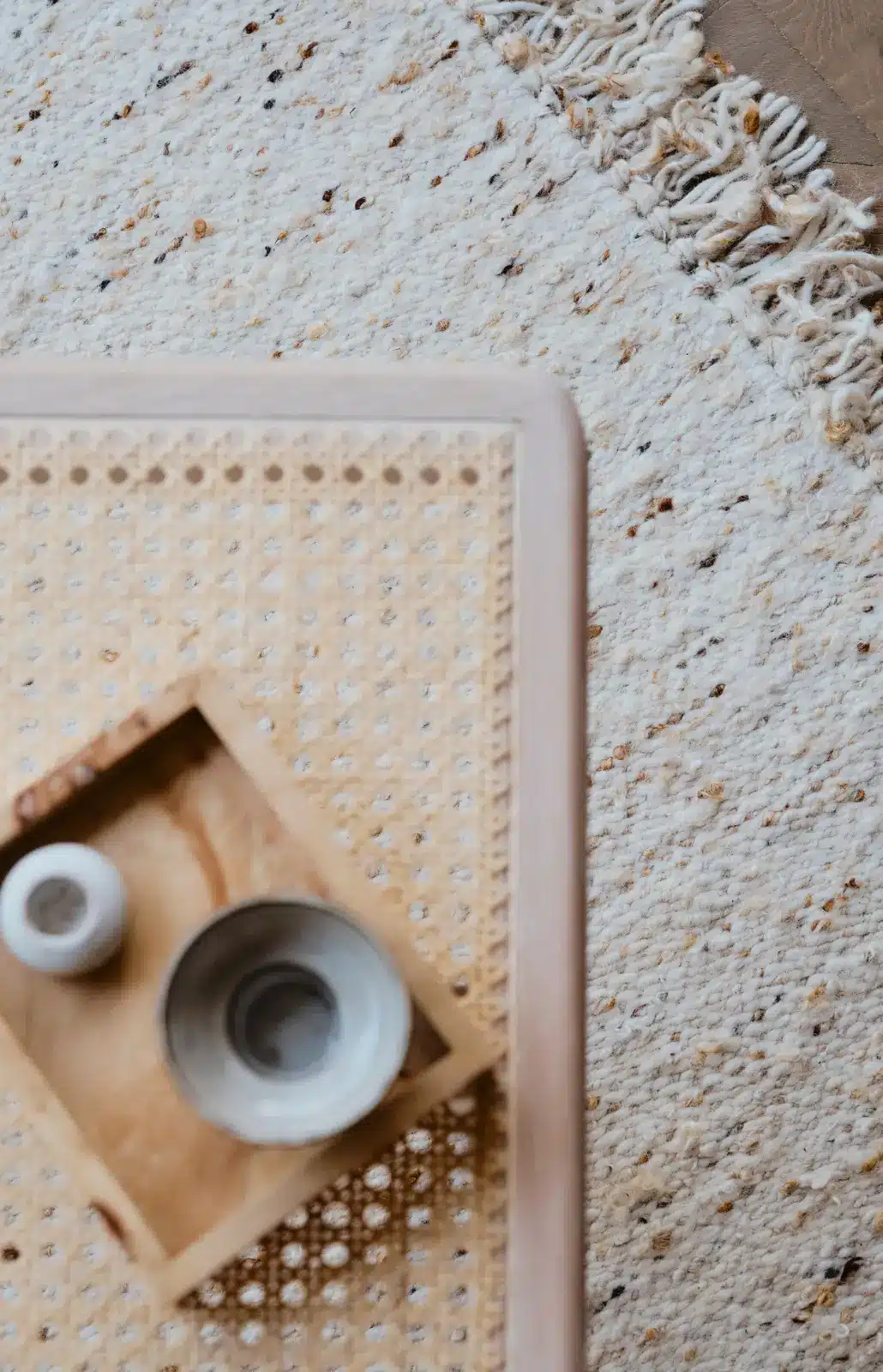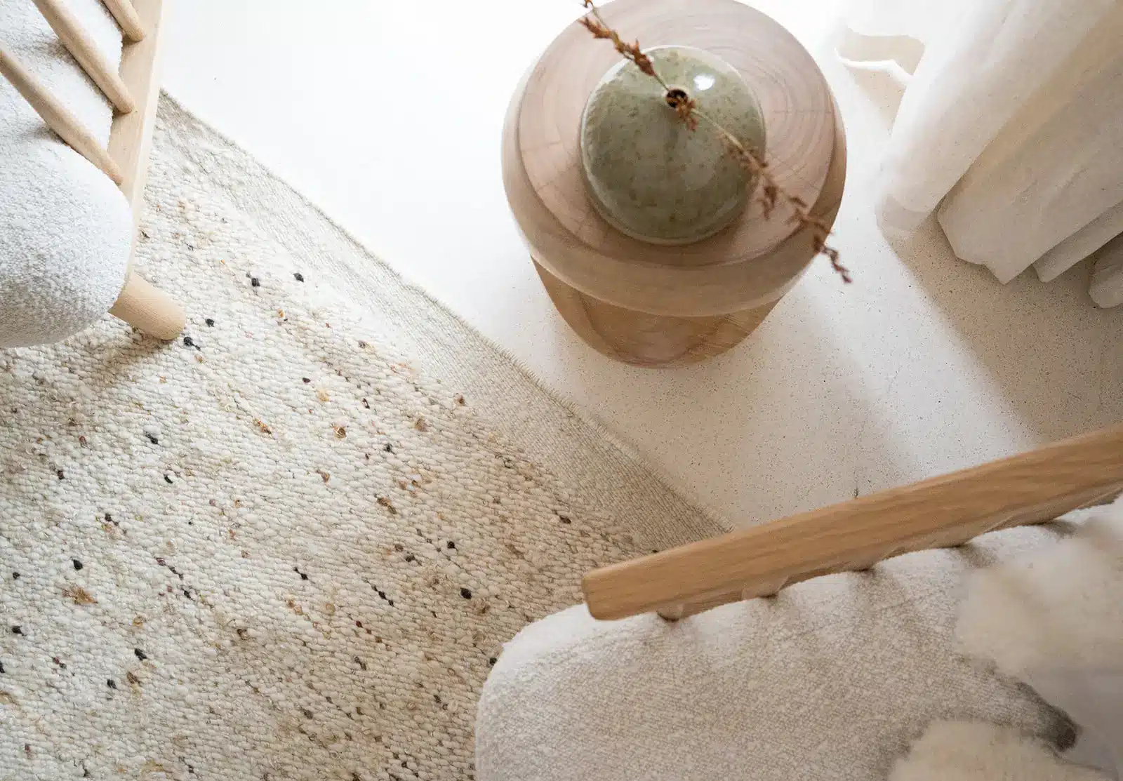 Custom Handwoven Veld Fleck Rug with Thin Spun Border in African Wool and Lox Mohair - White Cream Natural in Living Room with Boucle Armchairs and Wooden Side Table by Coral and Hive